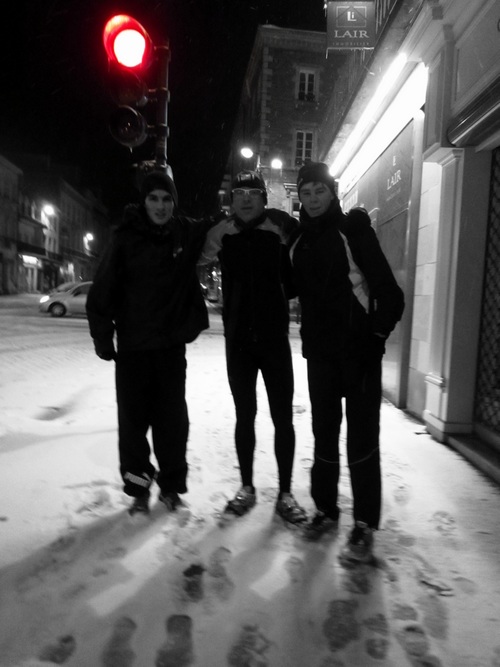 Rendez-vous chez Allain. Il ne court pas ce soir mais il a un mot d'excuse car il revient des fédéraux de cross FSGT à Marseille. On cause, on cause et personne n'arrive. Puis, soudain, deux types arrivent, fendant le blizzard. Albin et Simon, les deux cadets ont appris que leur entraînement du soir était annulé à cause de la neige. Mais le mardi, ils courent, non ? Alors, ils sont venus voir les vieux. Je vais faire quoi avec des gars qui courent le km en moins de 2'50" ???