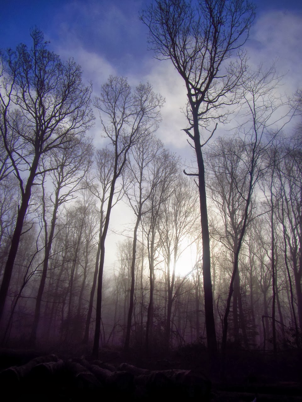 La brume, constituant une couche à peine plus haute que les arbres, a généré une lumière particulière que je m'empresse de saisir, sachant le phénomène éphémère.