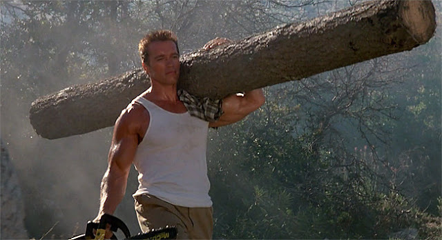 Un de mes Schwarzy préférés reste Commando dans lequel il tue les terroristes à moustache par groupe de deux à chaque tir. Je n'oublierai jamais la scène d'exposition du film où il se trimballe avec un tronc d'arbre :