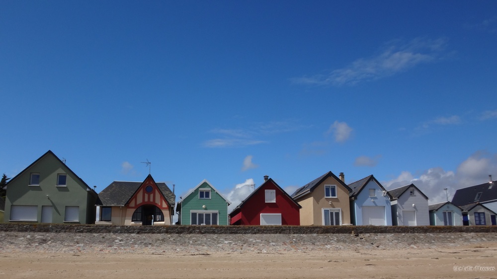 Arrivés au niveau de Gouville, nous passons par les fameuses cabanes à toit coloré inscrites au patrimoine local. La pluie s'est arrêtée mais le temps gris ne permet pas de faire de photos correctes des alignements de ces très jolies constructions dont l'histoire remonte au début du XXème siècle.