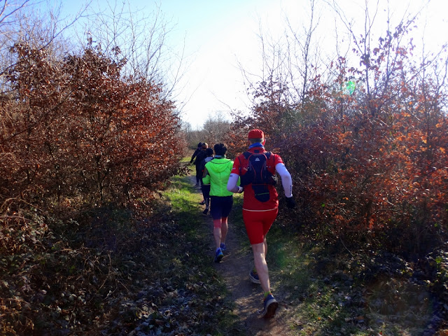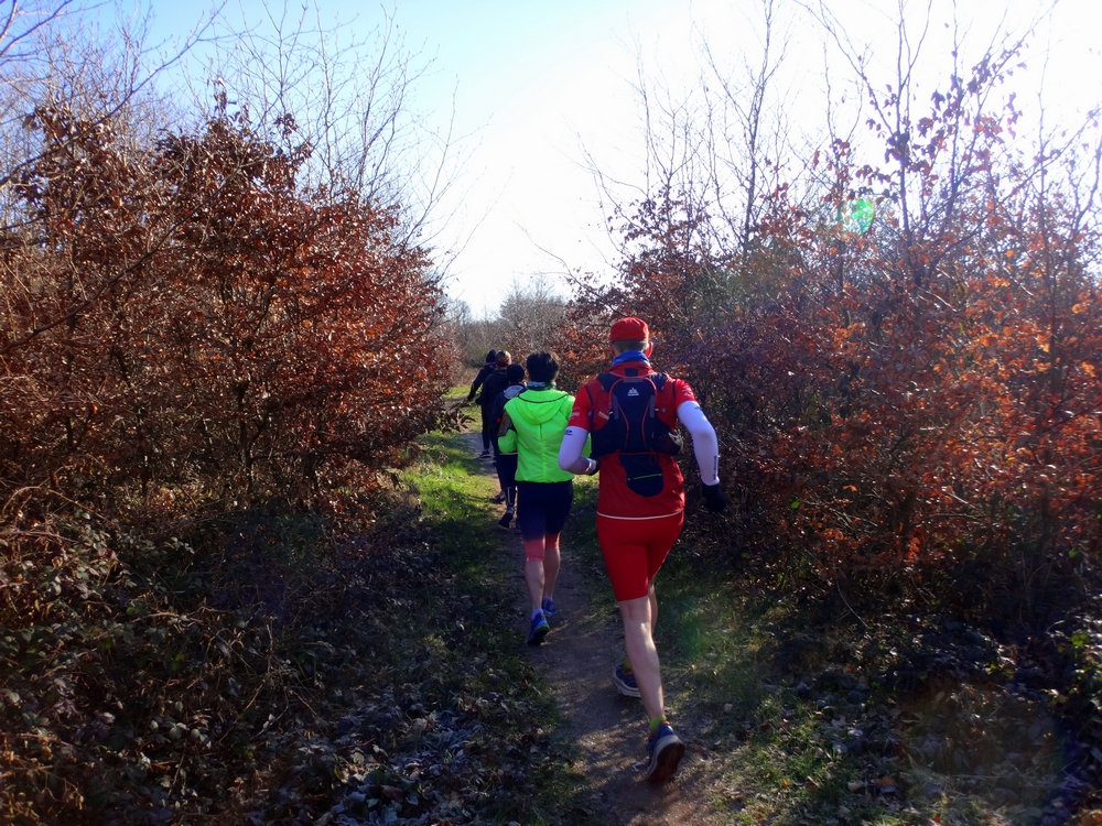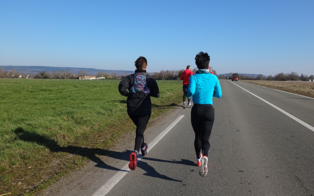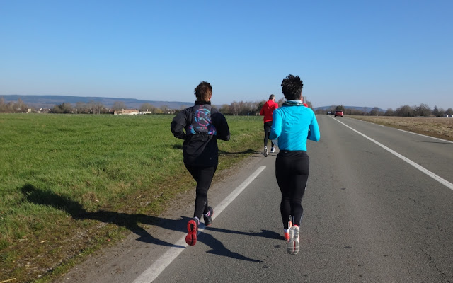 Magali et moi sommes accompagnés de Béa, Fab et Stéphane pour cette séance de long du samedi (allant d'1h30 à 2h15). Cette quatrième semaine, c'est relâche et donc seulement 1h30min pour 16,5 km dont 2x5000m à vitesse marathon (Alençon-Alençon en passant par la campagne de l'ouest). Comme d'habitude je passe mon temps à ralentir les filles dont l'instinct de cross-women reprend vite le dessus.