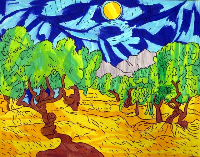 Le but est de reproduire un tableau en gardant sa liberté esthétique tout en respectant un cadre donné. Le travail est assez complexe mais les enfants sont suffisamment familiarisés avec Van Gogh pour se lancer.