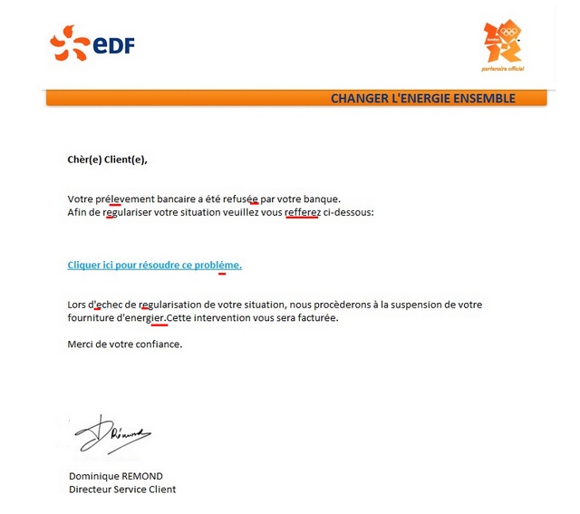 J'en ai reçu des mails d'escrocs (ma banque, Bouygues, le gouvernement...) mais celui-ci vaut franchement le détour ! Il faudrait vendre les fautes d'orthographe. Ce document est une vraie mine d'or !