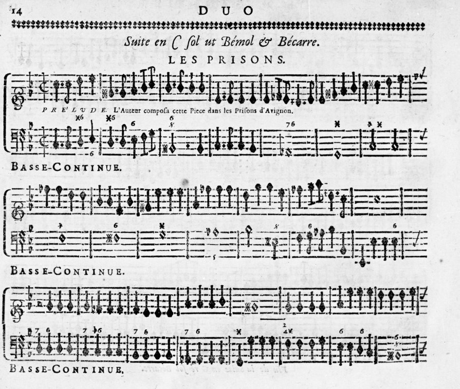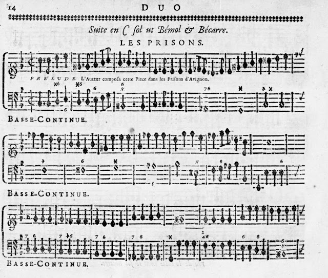 Revenu à Marseille, Pierre Gaultier y donna "Le Triomphe de la Paix" avec un grand succès puis partit en tournée dans toute la région avec sa troupe. Hélas, malgré l'affluence de nombreux spectateurs et le succès critique, Gaultier fut vite couvert de dettes et se retrouva jeté en prison faute de rembourser ses créanciers. C'est dans la prison d'Avignon qu'il composa la pièce présentée ici (voir partition ci-dessus). Ce duo (en l’occurrence flûte à bec alto et basse continue) exprime bien toute la mélancolie de l'auteur face au destin.
