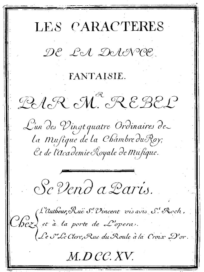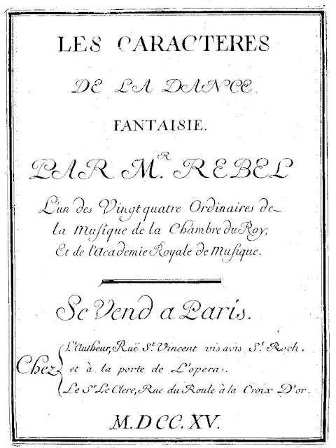 La pièce que j'ai choisie pour ce billet "Les Caractères de la Danse" s'insère parfaitement dans le cadre de l'Esprit français car on ne peut concevoir de musique française sans parler de la suite de danses. Cette pièce de Rebel a l'avantage de présenter un large éventail de ce qui se fait à l'époque, onze danses précédées d'un prélude entre lesquelles l'auteur intercale par deux fois un mouvement vif de sonate : Prélude-Courante-Menuet-Bourrée-Chaconne-Sarabande-Gigue-Rigaudon-Passsepied-Gavotte-Sonate-Loure-Musette-Sonate. Le tout en huit minutes !