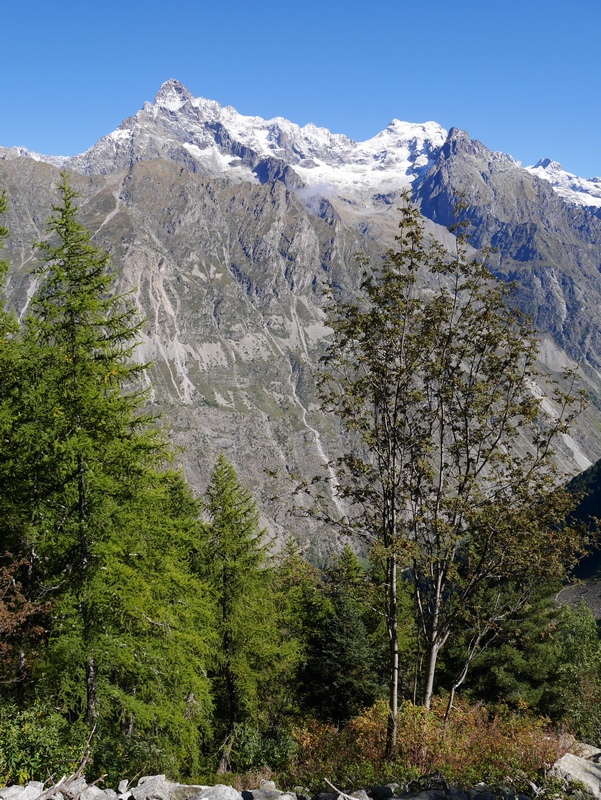 Après bien des efforts, nous débouchons de la forêt. Nous serons dominés et suivis jusqu'au bout par l'imposante silhouette de l'Olan (3564m).