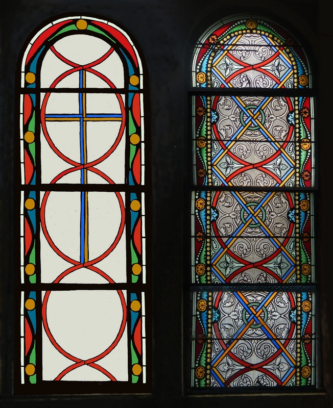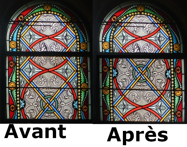 A l'origine, il y avait ces vitraux à restaurer. Il paraissait évident que le transfert de la partie gauche en bas de celle de droite s'imposait. C'est en faisant ce transfert sur écran que mon épouse s'est aperçu d'un problème : un des panneaux de droite avait été remonté tête en bas. Une petite manipulation informatique donna un aperçu de la forme originelle du vitrail :