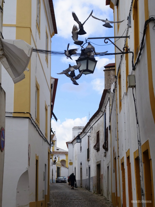 Évora, ville portugaise au passé prestigieux mais à la modestie surprenante. On ne peut pas dire que le tourisme a endommagé la cité. Avant de continuer notre voyage vers l'Algarve, nous y faisons une halte de deux jours pour y admirer les nombreux monuments allant de l'époque romaine jusqu'au XVIIIème siècle. Les photos prises sur place ressemblent à de banales photos de touristes. Seul ce cliché recèle une authenticité et une vie correspondant à ce que nous avons vécu sur place. Je voulais une image d'une de ces nombreuses rues étroites quadrillant la ville. Je n'avais en fait pas vu la silhouette si typique de la dame au cabas quand j'ai appuyé sur le déclencheur. A ce moment, il y eut un coup de vent qui fit s'envoler un groupe de pigeons ainsi que les rideaux d'une maison proche.