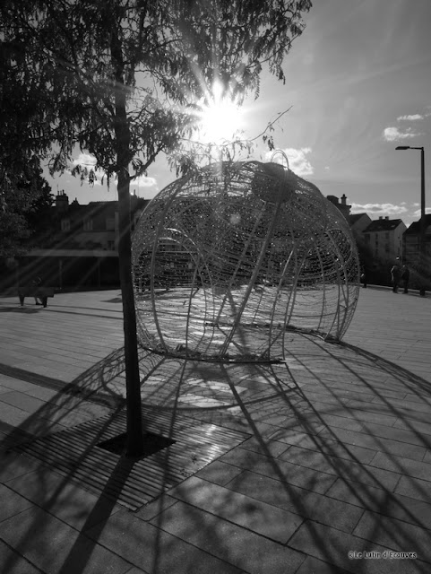 L'automne est magnifique. Comme bien souvent, j'arpente la ville avec Tonton Gilles, écoutant avec attention ses conseils en technique photographique. Lors de ces pérégrinations, nous prenons généralement les mêmes scènes en photo mais nos images sont toujours très différentes, lui avec son Reflex Canon et sa batterie d'objectifs et moi qui ne photographie qu'avec de petits appareils hybrides ou compacts. Sur l'esplanade de la gare de bus, cet anachronisme : une boule de Noël que les services de la ville n'ont finalement jamais démontée. Avec toutes ces ombres, le cliché en contre-jour est indispensable, la profondeur de champ maximum rajoute les lignes solaires et les pavés complètent l'aspect géométrique de l'image. Les couleurs sont très belles mais je décide que la photo sera en noir et blanc, ce qui souligne son esthétique presque abstraite.