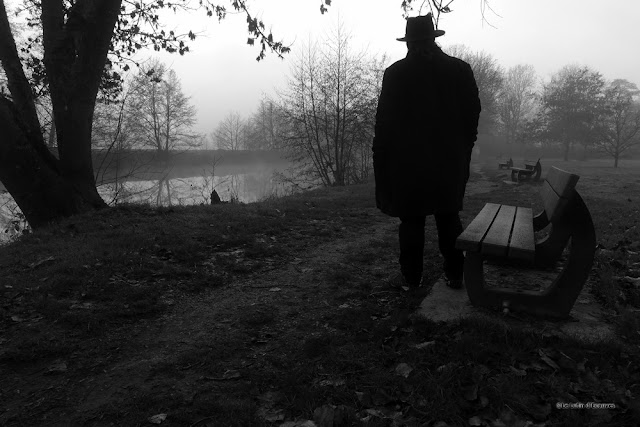 Arboretum d'Alençon, je suis de nouveau avec Tonton Gilles. La nuit tombe et j'expérimente la photo avec trépied, technique indispensable si l'on veut faire quelque chose de net avec si peu de lumière. La pose est d'un tiers de seconde et la profondeur de champ maximale. Le temps brumeux impose un noir et blanc filtré sur le vert pour que l'herbe ne soit pas trop sombre. Tonton Gilles me prête sa silhouette typique qui se découpe nettement sur le fond. Une nouvelle photo mystérieuse comme je les aime.