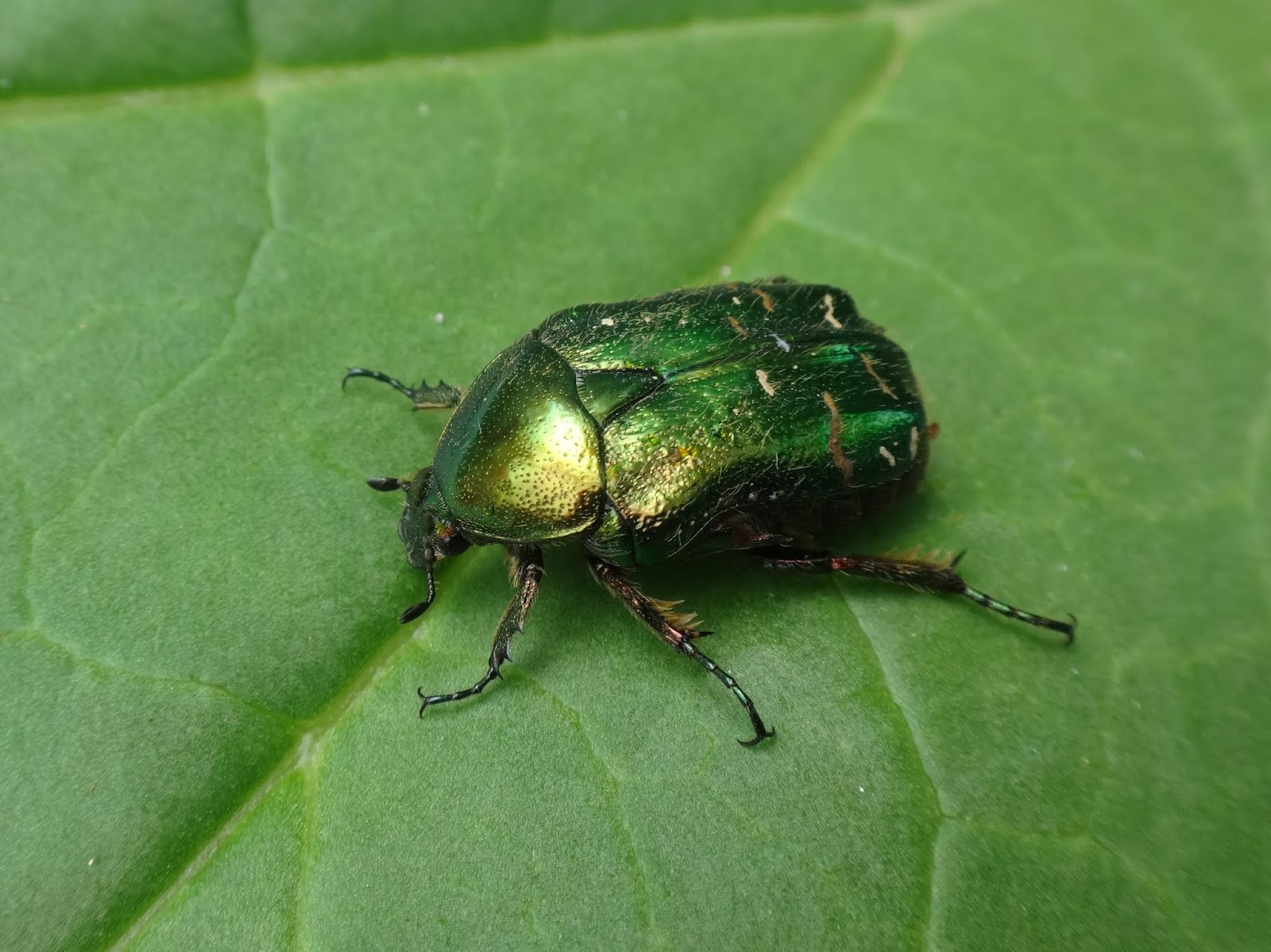 La cétoine dorée fait partie d'une autre famille que les chrysomèles même si sa jolie couleur métallique peut faire penser à ces derniers. C’est un gros insecte au vol bruyant totalement inoffensif car surtout polliniphage ce qui en fait par conséquent un pollinisateur très efficace car il va de fleur en fleur pour se nourrir. Ses larves ressemblent à celles du hanneton et les ignorants les suppriment alors que ces larves ne se nourrissent que de débris et sont très utiles à l'élaboration de votre compost.