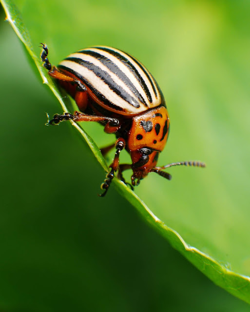 Ce chrysomélidé est, lui, bien d'origine américaine, du Colorado exactement. Le doryphore s'y nourrissait de morelle rostrée quand on introduisit la pomme de terre dans sa région vers 1850. Tout comme le Belge adopta la frite, le doryphore raffola de la pomme de terre et se mit à suivre sa progression dans tout le pays. Il attendit la Première Guerre Mondiale pour franchir l'Atlantique et, contrairement à ce qu'on croit, il n'est aucunement responsable de la famine de 1845-1852 en Irlande qui fit un million de morts (les deux responsables furent le mildiou et le gouvernement ultra-libéral de John Russell qui était un fervent adepte du laisser-faire en économie). Cela dit, le doryphore fit bien des ravages dans les années 1940 dans notre pays. A cette époque, on employait parfois les enfants des écoles (comme ma maman) pour ramasser ces insectes à la main (c'est facile et efficace). A noter que nos amis Allemands se livrant à l'époque à des réquisitions de nourriture sur le dos des Français eurent droit au sobriquet de "doryphores". Depuis, la lutte chimique s'est avérée un peu trop efficiente car ce bel insecte se fait nettement plus rare dans les jardins.