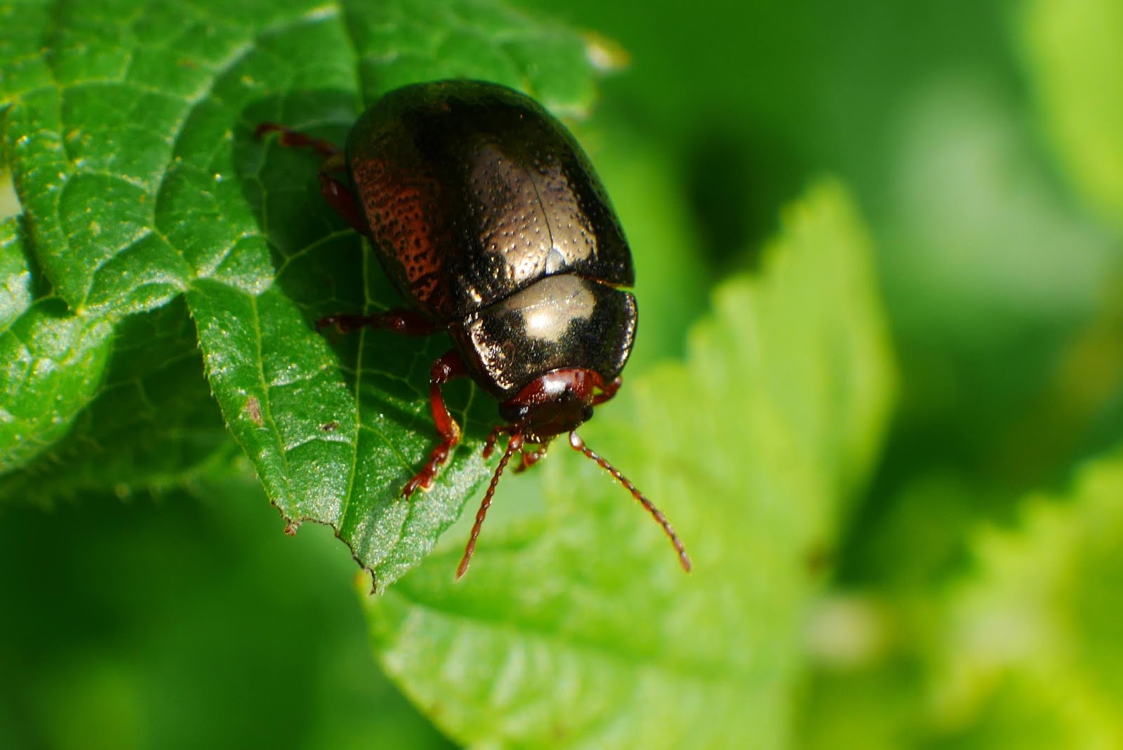 Petit bijou aux reflets métalliques, la chrysomèle de la menthe vit et se reproduit dans des massifs de menthe que nous entretenons exprès pour ce petit dévoreur insatiable qui nous en laisse quand même un peu... Certains individus ont des reflets bronze.