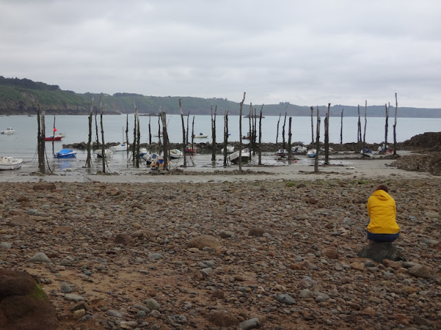 Ici, nous pique-niquons rapidement car la bruine se fait pluie... La remontée de la falaise est vraiment trop dure, nous profitons de la marée basse pour passer par l’estran jusqu'à Port Moguer et sa digue en granite rose, là la pente est plus douce.